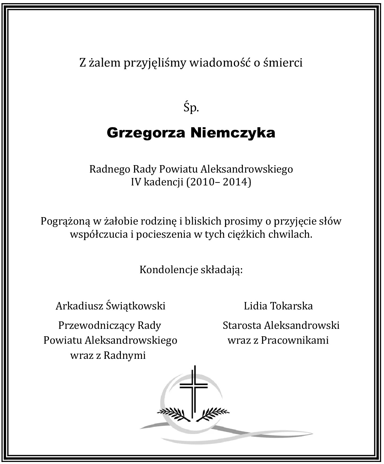 Z ogromnym żalem przyjęliśmy wiadomość o śmierci śp. Grzegorza Niemczyka, Radnego Rady Powiatu Aleksandrowskiego IV kadencji (2010 - 2014)