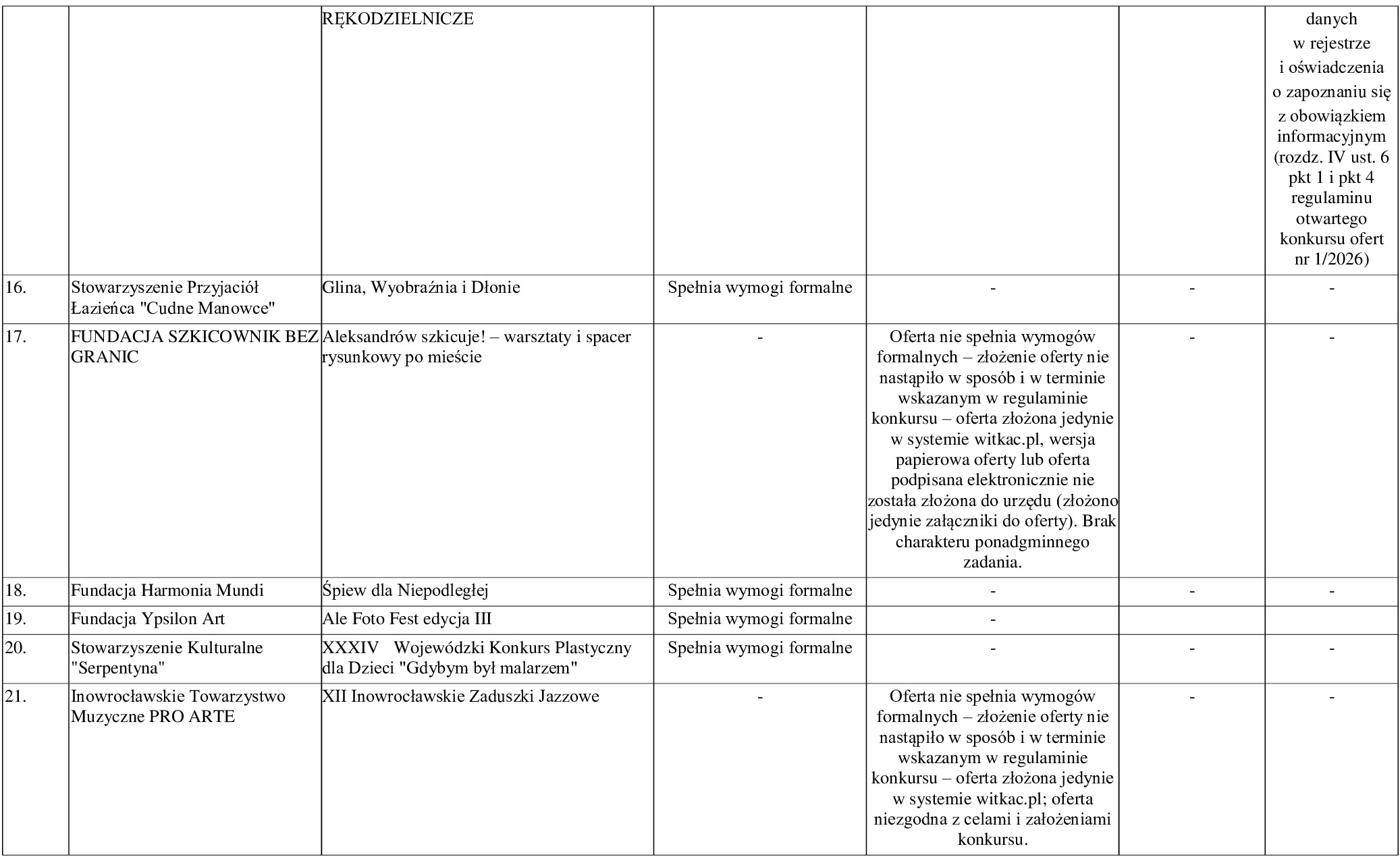 Komisja konkursowa powołana uchwałą Nr 245/2026 Zarządu Powiatu Aleksandrowskiego z dnia 18 lutego 2026 roku w celu opiniowania złożonych ofert w otwartym konkursie ofert nr 1/2026 na wykonywanie zadań publicznych związanych z realizacją zadań Powiatu Aleksandrowskiego w 2026 r. w zakresie kultury i ochrony dziedzictwa narodowego pod nazwą „Upowszechnianie kultury, wspieranie działań i inicjatyw kulturalnych”, ogłoszonym uchwałą Nr 236/2026 Zarządu Powiatu Aleksandrowskiego z dnia 22 stycznia 2026 r., w dniu 24 lutego 2026 roku, dokonała oceny formalnej złożonych ofert.