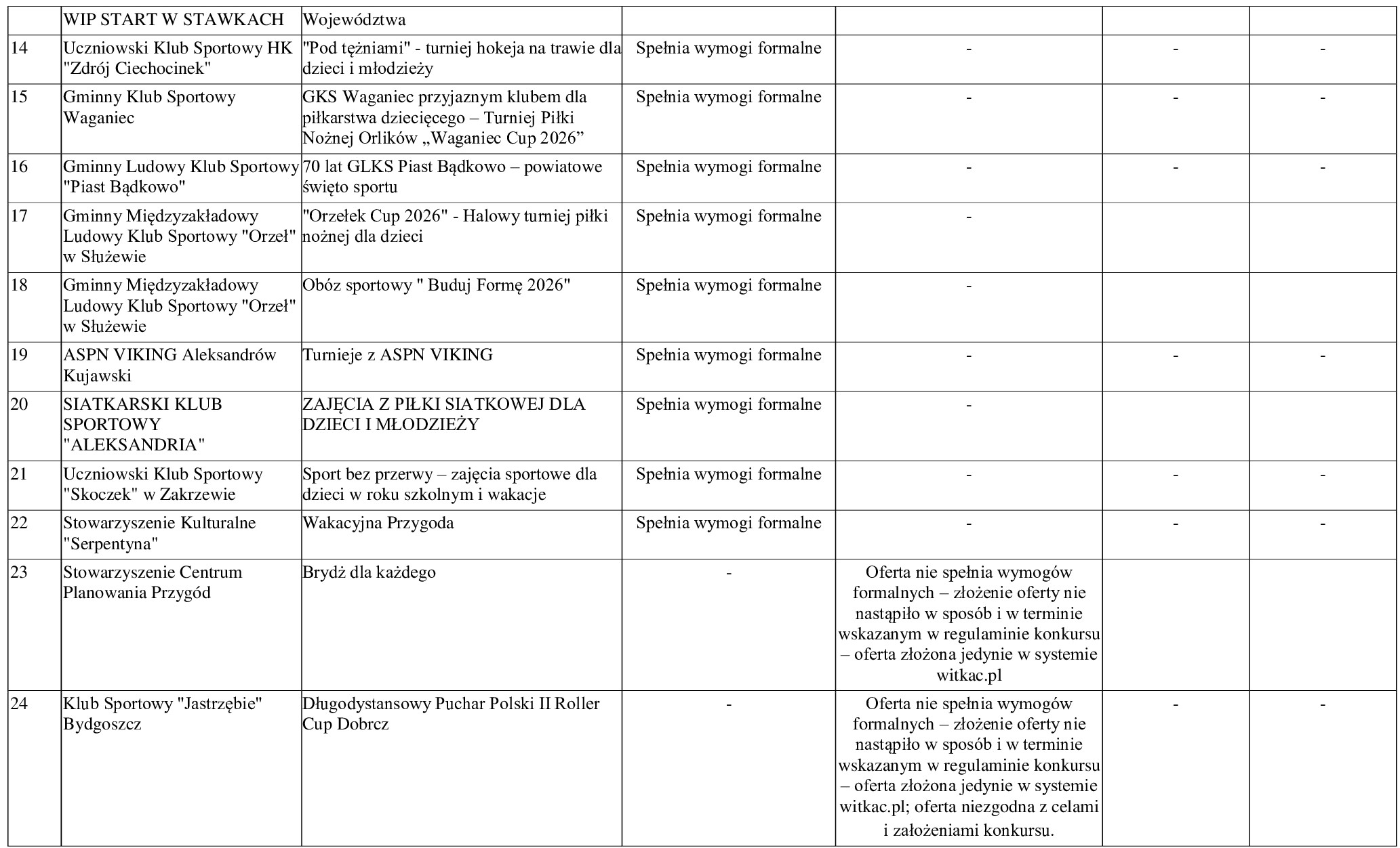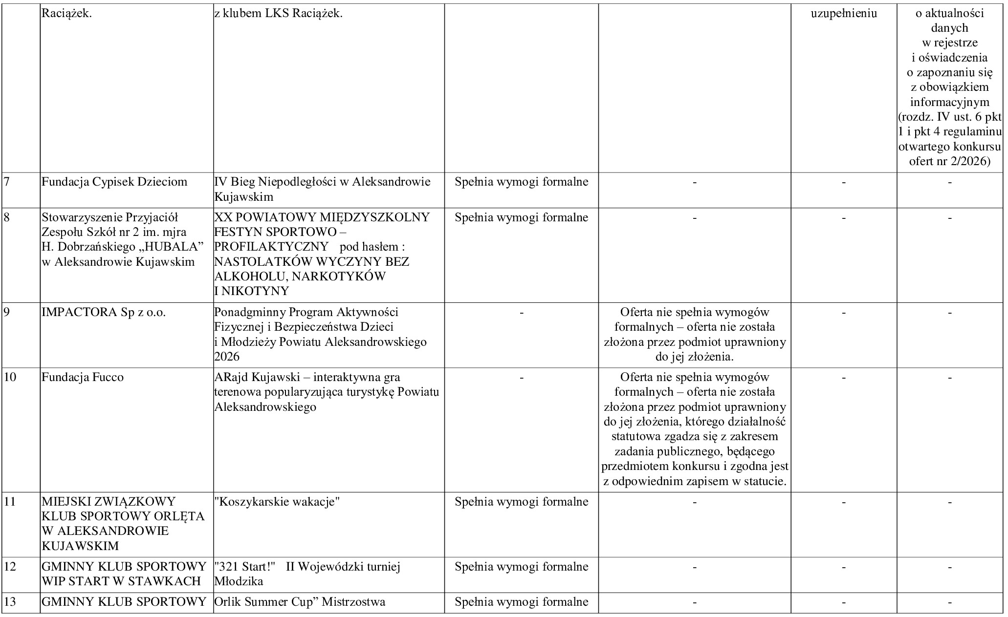 Komisja konkursowa powołana uchwałą Nr 245/2026 Zarządu Powiatu Aleksandrowskiego z dnia 18 lutego 2026 roku w celu opiniowania złożonych ofert w otwartym konkursie ofert nr 2/2026 na wykonywanie zadań publicznych związanych z realizacją zadań Powiatu Aleksandrowskiego w 2026 r. w zakresie kultury fizycznej i turystyki pod nazwą ”Upowszechnianie i rozwój kultury fizycznej i turystyki”, ogłoszonym uchwałą Nr 236/2026 Zarządu Powiatu Aleksandrowskiego z dnia 22 stycznia 2026 r., w dniu 24 lutego 2026 roku, dokonała oceny formalnej złożonych ofert.